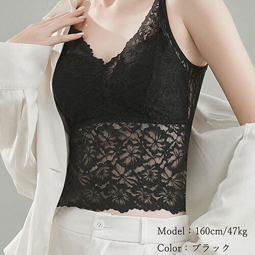 繊細な花柄レースが女性らしさを引き立てる、カップ付きキャミソール。