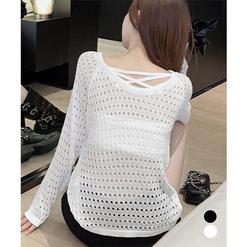 フェミニンにもモードにも着こなせる、前後2WAY仕様の透かし編みトップス。