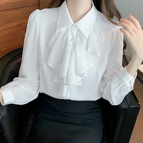 エレガントな雰囲気を漂わせる、フリル×リボンタイの韓国風ブラウス。