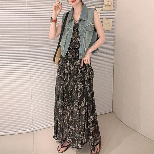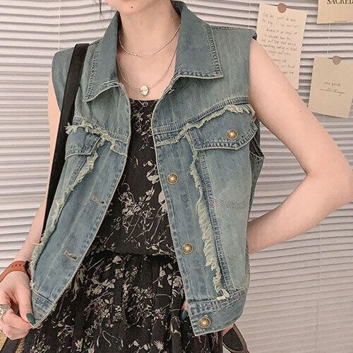 ウォッシュ加工とフリンジディテールが目を引く、ヴィンテージライクなデニムベスト。