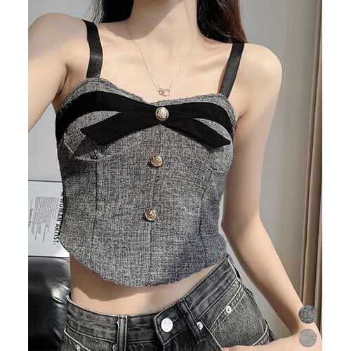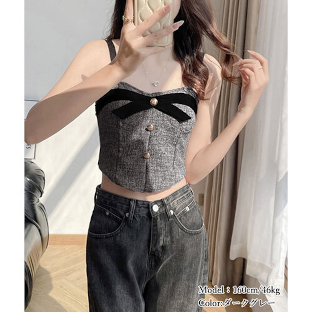 ツイード素材でセクシーかつ大人可愛い印象を演出する、カップ付きキャミソール。クロスリボンやシャーリングがアクセントになり、へそ出しのクロップド丈で夏らしい爽やかさも。ブラなしで快適に着用でき、1枚でもインナー使いでもおしゃれに決まる万能トップスです。