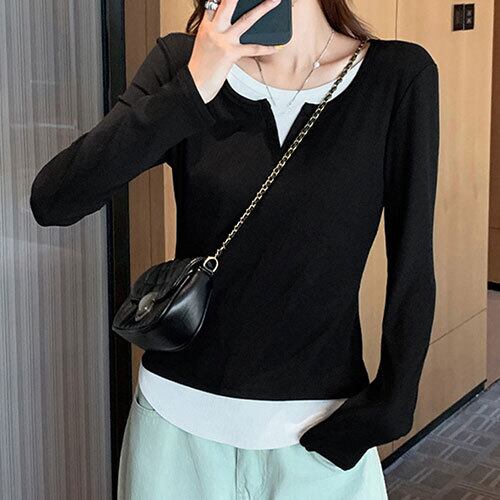 スリットネックが程よい抜け感を演出する、レイヤード風のスリムTシャツ。デコルテを美しく見せるネックラインと、襟元・裾の重ね着風デザインがこなれ感をプラス。ストレッチの効いたフィット感で細見え効果も◎。シンプルな無地デザインで、デニムやスカートと合わせてカジュアルにもきれいめにも活躍。大人カジュアルにぴったりな、着回し力抜群の長袖インナートップスです。