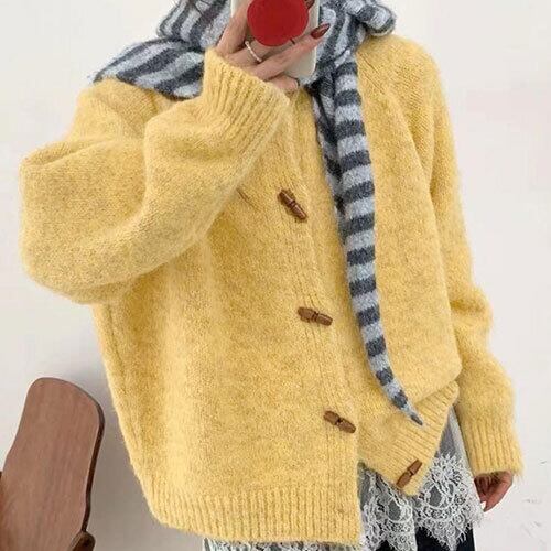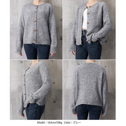 ソフトな風合いとトグルボタンが魅力のクルーネックニットカーディガン。ゆったりとしたシルエットでリラックス感がありながら、こなれた大人可愛い印象を演出します。前開きで羽織れば軽やかに、ボタンを閉じればプルオーバー風にも着られる2WAY仕様。無地で合わせやすく、きれいめカジュアルから韓国風スタイルまで幅広く活躍する、おしゃれな万能トップスです。