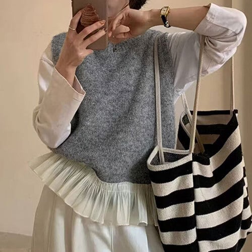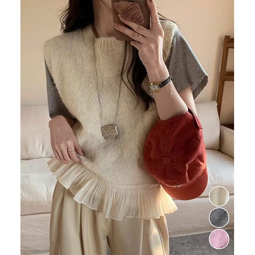 裾のプリーツフリルがアクセントのノースリーブニットベスト。ほどよい厚みで立体感あるシルエットを演出し、着やせ効果も期待できます。シンプルな無地デザインながら、フリルの甘さが韓国ファッションらしいガーリーな雰囲気をプラス。Tシャツやブラウスに重ねるだけで旬のレイヤードコーデが完成し、ワイドパンツやデニムと合わせればこなれ感のあるスタイルに。春秋冬のデイリーウェアとして着回しやすく、大人可愛い印象を与える一枚です。