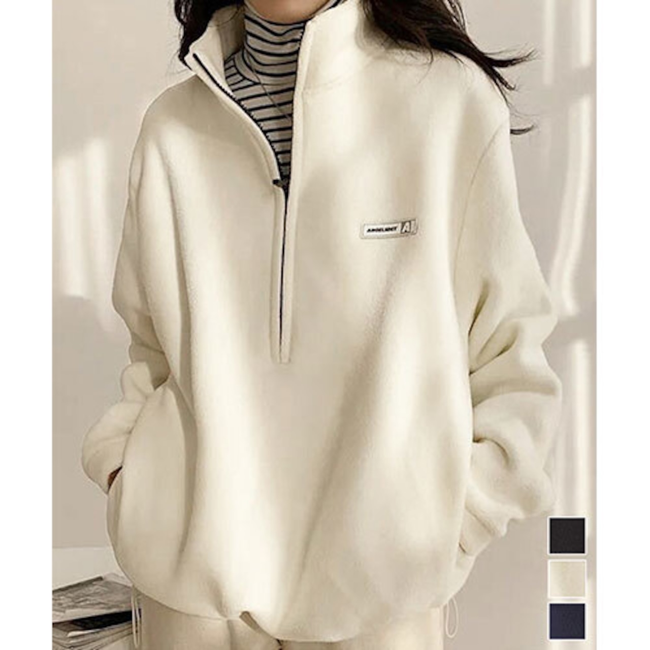 柔らかい起毛フリース素材を使用したハーフジッププルオーバー。軽量で暖かく、寒い季節に活躍する一枚です。ゆったりとしたドロップショルダーのシルエットが抜け感を演出し、カジュアルながらこなれた印象に。モックネック仕様で首元まで暖かく、裾のドローコードで好みのフォルムに調整可能。シンプルなデザインでデニムやスウェットパンツなど幅広いボトムスに合わせやすく、デイリーコーデに取り入れやすい秋冬の万能トップスです。