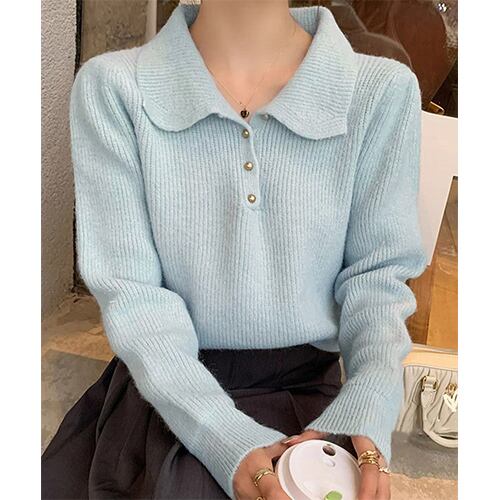 ポロカラーが上品な印象を与えるニットトップスは、胸元のゴールドボタンがアクセントとなり、シンプルながら華やかさをプラスします。柔らかなタッチとほんのり起毛感のある風合いで、やさしい着心地を実現。厚すぎない生地なのでアウターの中でももたつかず、春秋は一枚で、冬はインナーとしても活躍できる万能アイテムです。オンオフ問わず幅広いシーンで取り入れやすく、着回し力も抜群の一枚です。