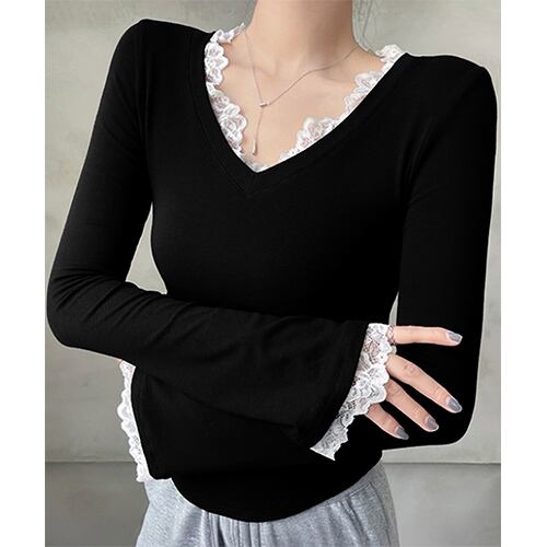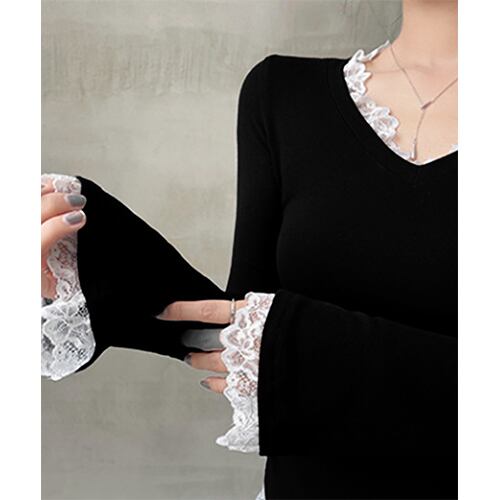 レース使いが可愛い長袖トップスは、程よいフィット感とサイドギャザーで華奢見えを叶え、体のラインを美しく演出します。袖や首元のレースディテールが女性らしさと抜け感をプラスし、シンプルながらも上品な印象に。キャミワンピやデニムと合わせれば甘辛MIXコーデにぴったりで、スウェットのインナーとしても首元や手元からレースが覗き、ガーリーなアクセントを添えます。季節やシーンを問わず幅広く着回せる万能アイテムです。