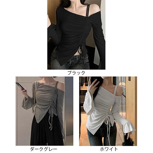 片肩のオフショルダーとドローストリングがポイントの韓国風新作長袖Tシャツは、トレンド感を存分に楽しめる一枚。袖口のフレアスリーブが華やかさを添え、手元まで女性らしい雰囲気を演出します。デニムと合わせればこなれたカジュアルスタイルに、スカートと組み合わせればフェミニンな印象に仕上がるなど、幅広いコーディネートに対応可能。シンプルながら存在感があり、日常使いからお出かけまで活躍する万能トップスです。