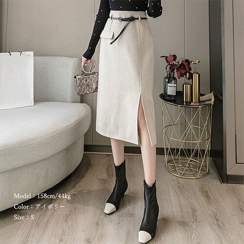 ベルト付きのフロントスリットペンシルスカートは、ハイウエスト仕様でスタイルアップを叶える上品な一枚。ウールタッチ素材で仕立てられ、程よくフィットするタイトなIラインシルエットが女性らしさを引き立てます。膝下丈のミディロングで清楚かつエレガントな印象を演出。フロントスリットが抜け感をプラスし、コンシールファスナーにより後ろ姿もすっきりと美しく仕上がります。コンパクトなニットできれいめに、ゆるめニットで大人カジュアルにと幅広いスタイルに対応可能です。