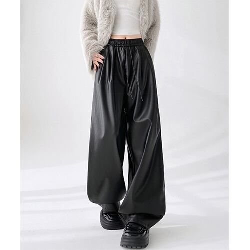 光沢感のあるPUレザーを使用したストレートシルエットのレディースパンツ。程よいハリと防風性で季節の変わり目も快適に着用でき、ゆったりとしたワイドシルエットが脚のラインを拾わずスタイルアップを叶える。両サイドのポケット付きで実用性も高く、見た目にもスマート。ショート丈トップスやニットと好相性で、秋冬のストリートやカジュアルコーデに幅広く活躍する万能アイテムです。