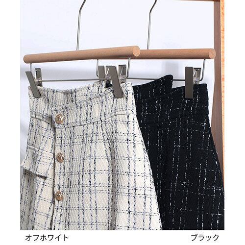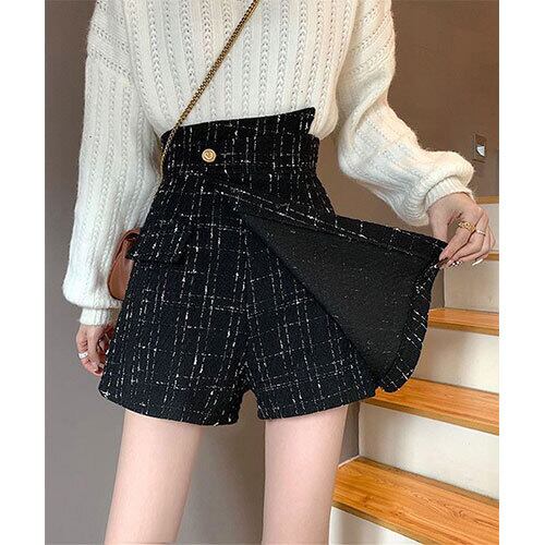 ツイード調のチェック柄が上品な印象を与えるハイウエストのラップ風ミニスカパン。フロントボタンやアシンメトリーデザインが目を惹き、脚をすっきり長く見せてスタイルアップ効果も期待できる一枚です。飾りポケット付きで大人らしいきれいめな雰囲気を演出。ブラウスやニットとの相性も良く、通勤やお出かけ、デートなど幅広いシーンで活躍できる万能アイテム。美脚効果と実用性を兼ね備えた、洗練された大人の女性におすすめのパンツです。