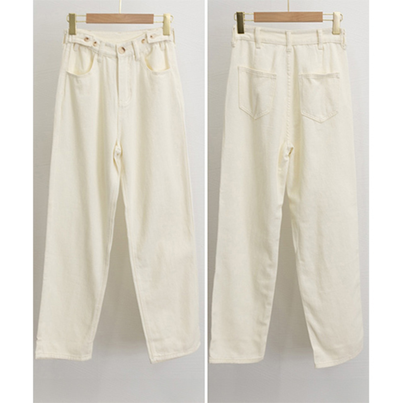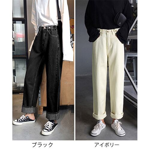ウエストボタンでサイズ調整可能なハイウエスト×ストレートの美脚デニムパンツ。裾は折り返しとそのままの2WAY仕様で、しっかりとしたコットン素材を使用しているためオールシーズン活躍します。スウェットやロンTと合わせればカジュアルに、シャツやニットと合わせればきれいめにも着こなせる万能アイテム。毎日穿きたくなる快適さと着回し力を兼ね備えた一本です。