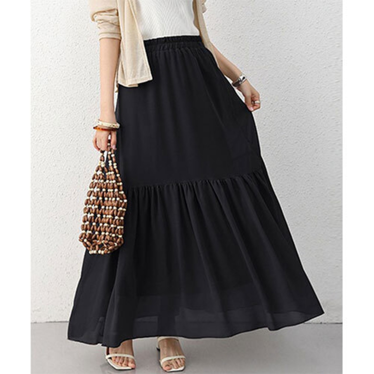 ウエストゴムで楽に着られる韓国風ティアードマキシスカート。Aラインのフレアシルエットにギャザーを施し、体型カバーも叶うボリューム感が魅力。無地でオフィスカジュアルにも対応し、エアリーなシフォン素材が女性らしさを引き立てます。歩くたびに軽やかに揺れ、上品でフェミニンな印象を演出。レーストップスやノースリーブと合わせれば華やかでやさしい雰囲気のコーデが完成し、幅広いシーンで活躍する万能ボトムスです。