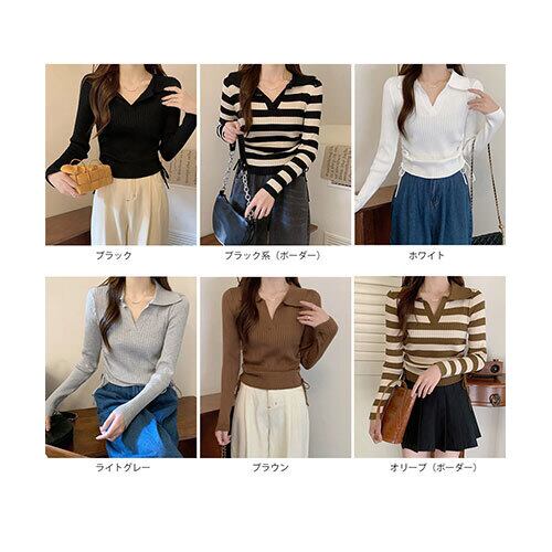 Vネックとポロ襟デザインで首元をすっきり見せるレディースリブニットトップス。ショート丈で程よくフィットし、細身シルエットがボディラインを美しく引き立てる。両サイドのドローストリングがアクセントとなり、シルエット調整も可能。シンプルながら韓国風のトレンド感を取り入れたデザインで、春秋の普段着からきれいめカジュアルまで幅広く活躍。デニムやスラックスと合わせればこなれ感のある大人スタイルを演出できる万能アイテム。