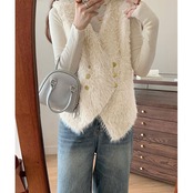 ふわふわのフェイクファー素材を使用したVネックダブルボタンベスト。柔らかく暖かみのある質感で軽やかに羽織れ、秋冬のレイヤードスタイルに最適です。上品なダブルボタンがアクセントとなり、カジュアルからきれいめまで幅広く対応。シャツやニット、ロンTの上に重ねるだけで旬のスタイリングが完成し、体型カバーも叶う万能アイテム。軽量で着心地も良く、オフィスカジュアルからデイリーまで活躍する大人可愛い韓国風ベストです。