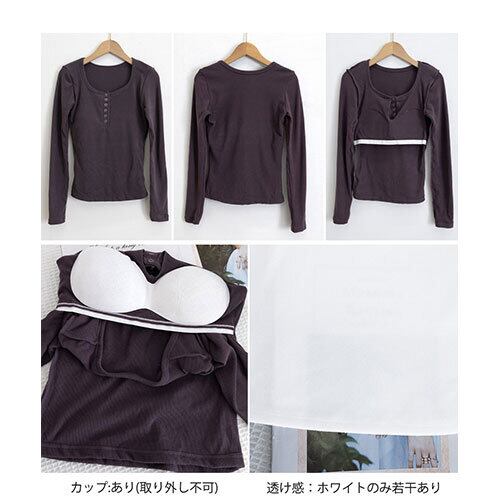 ヘンリーネックデザインがポイントのリブ編み長袖カットソー。起毛素材で暖かく、秋冬のインナーや一枚着として活躍します。フロントのボタンがさりげないアクセントになり、シンプルながら大人カジュアルな雰囲気を演出。カップ付きで下着を気にせず着用でき、程よいフィット感で体型をきれいに見せる効果も。デニムやスカート、ワイドパンツなど幅広いボトムと好相性で、韓国風の大人可愛いスタイルを楽しめる着回し力抜群の冬の必須アイテムです。