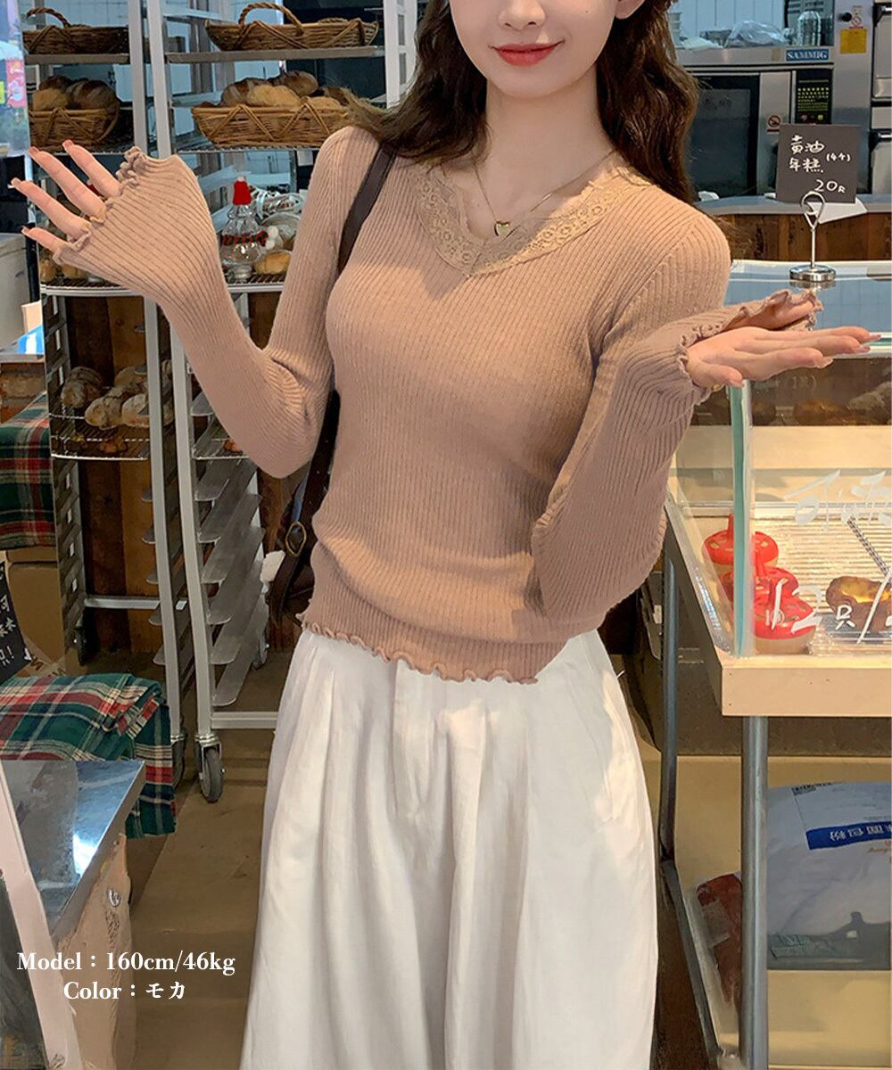 女性らしい印象を引き立てるリブニットトップス。繊細なレースのVネックがデコルテを美しく見せ、袖口と裾のメロウフリルがほどよい甘さをプラスします。柔らかく伸縮性のある生地で快適な着心地を実現し、体に自然にフィット。1枚で着ても華やかさがあり、デートやお出かけなど特別なシーンにもぴったり。上品さと可愛らしさを兼ね備えた万能アイテムで、季節を問わず幅広いコーディネートに活躍します。