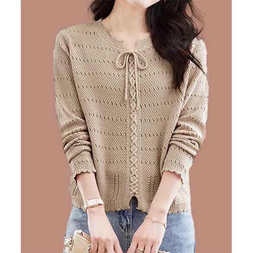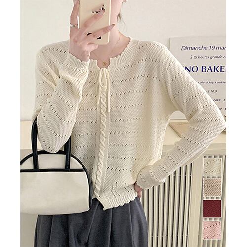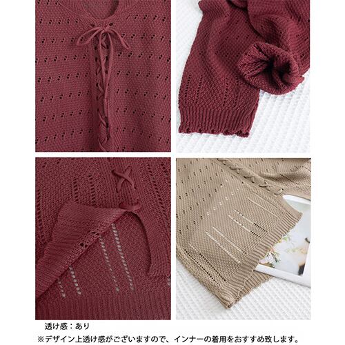 フロントのレースアップ風リボンがアクセントとなり、シンプルなデザインに可愛らしさを添えるニットトップス。袖口と裾のスカラップ仕上げが女性らしい柔らかな雰囲気を演出し、ほどよい透かし編みが軽やかな印象をプラスします。デニムやスカートなど幅広いアイテムと相性が良く、カジュアルにもフェミニンにも着こなし可能。1枚で存在感があり、季節を問わずコーディネートを華やかに仕上げる万能アイテムです。