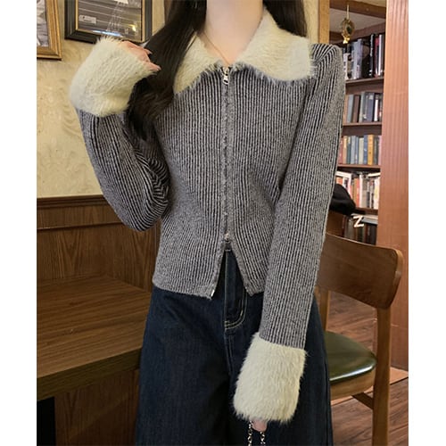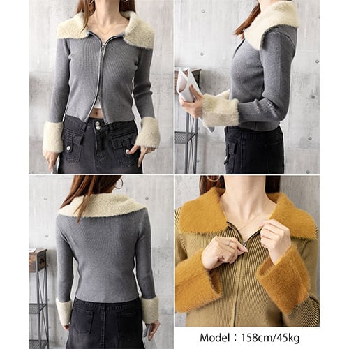 上品なフェイクファーをあしらったダブルジップ仕様のニットカーディガンは、衿元と袖口の柔らかなファーが高級感を演出。縦リブ編みが立体感を生み出し、視覚的にスリムな印象を与えます。タイトなシルエットで女性らしさを際立たせつつ、カジュアルにも大人っぽく着こなせるのが魅力。ショート丈のすっきりとしたフォルムはどんなボトムスとも好相性で、スタイリングの幅を広げる万能アイテム。日常から特別なシーンまで活躍する洗練された一枚です。