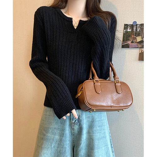 すっきり見えるリブ編みデザインが特徴の長袖ニットトップス。首元のスリットが抜け感をプラスし、こなれた印象を演出します。シンプルながら洗練された雰囲気があり、フレアスカートやワイドパンツと合わせればきれいめカジュアルなスタイルが完成。程よいフィット感で女性らしいシルエットを引き立てつつ、デイリーからお出かけまで幅広く活躍する万能アイテムです。季節を問わず着回しやすく、1枚で存在感を放つトップスとしておすすめです。