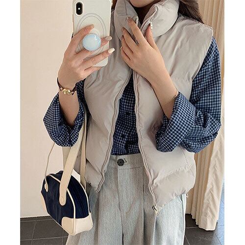 軽くて暖かいダウン風中綿ベスト。高めのスタンドカラーで首元まで防寒でき、フロントジップで着脱もスムーズ。ハンドウォーマーポケット付きで機能性も高く、スポーティながら上品な雰囲気を演出します。シンプルなショート丈デザインで、ロングTシャツやタートルネック、ブラウスなど幅広いインナーと好相性。カジュアルコーデはもちろん、通勤スタイルにも馴染む万能アイテムで、大人っぽく洗練された韓国風コーデを叶える一枚です。