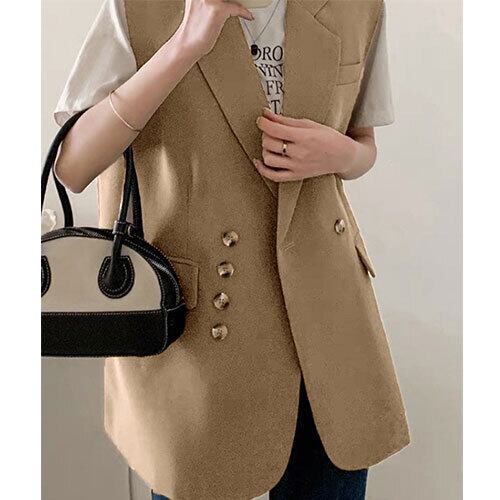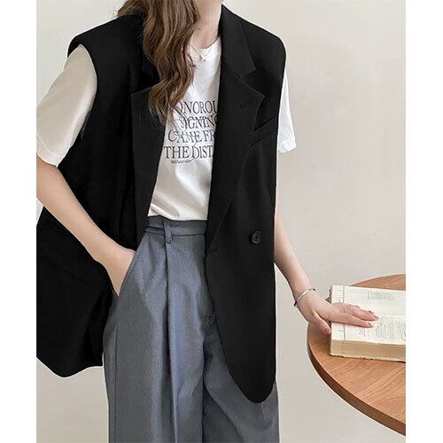 トレンド感あるダブルブレストが印象的なテーラードジレ。程よい長め丈で体型をさりげなくカバーし、さらりとした生地で春夏秋冬快適に着られる万能ライトアウターです。Tシャツやシャツに重ねるだけで大人カジュアルからモードまで幅広いスタイルに対応。デニムやスラックスはもちろん、ワンピースとのレイヤードにもおすすめで、通勤通学から休日まで活躍。シンプルながら洗練された雰囲気を演出できる、着回し力抜群のノースリーブジャケットです。