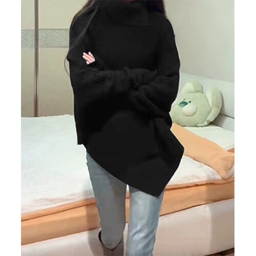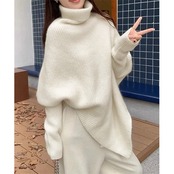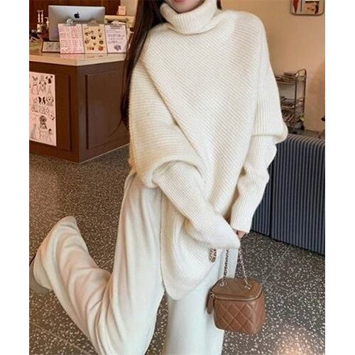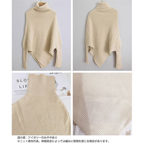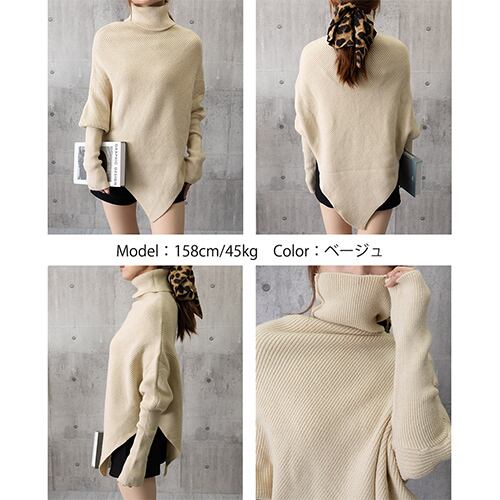 ハイネックとアシンメトリーなデザインが印象的なバットウィングスリーブニットセーター。ゆったりとしたシルエットと柔らかな素材で、長時間でも快適に過ごせる一枚。ワイドベルトでウエストマークすればメリハリが生まれ、スタイルアップも叶う。細身パンツやタイトスカートと合わせると、フェミニンで上品な雰囲気が引き立ち、幅広いシーンで活躍するアイテム。