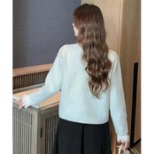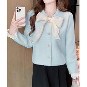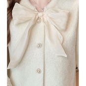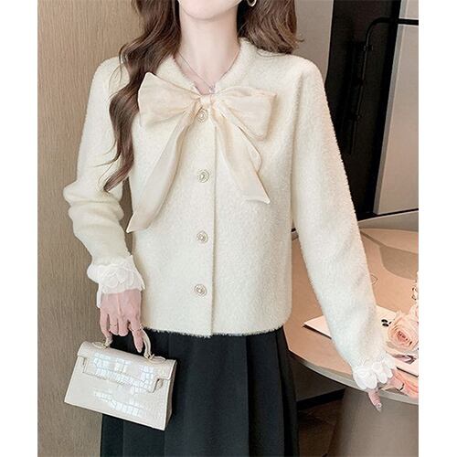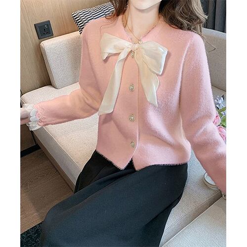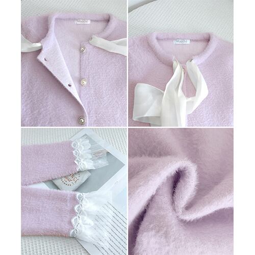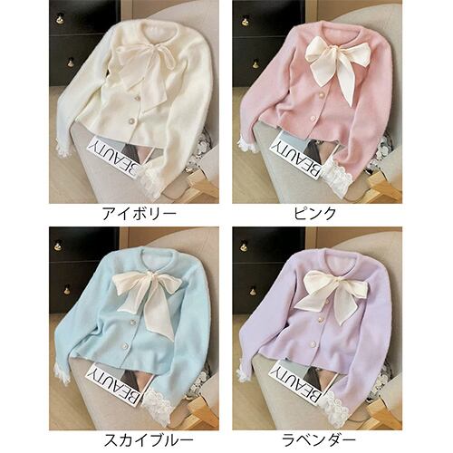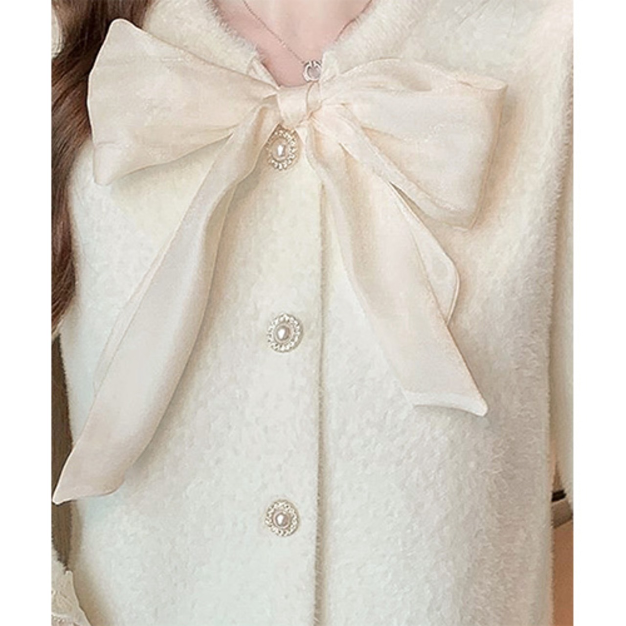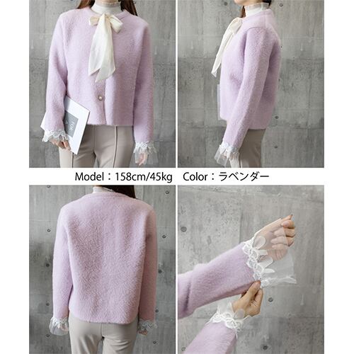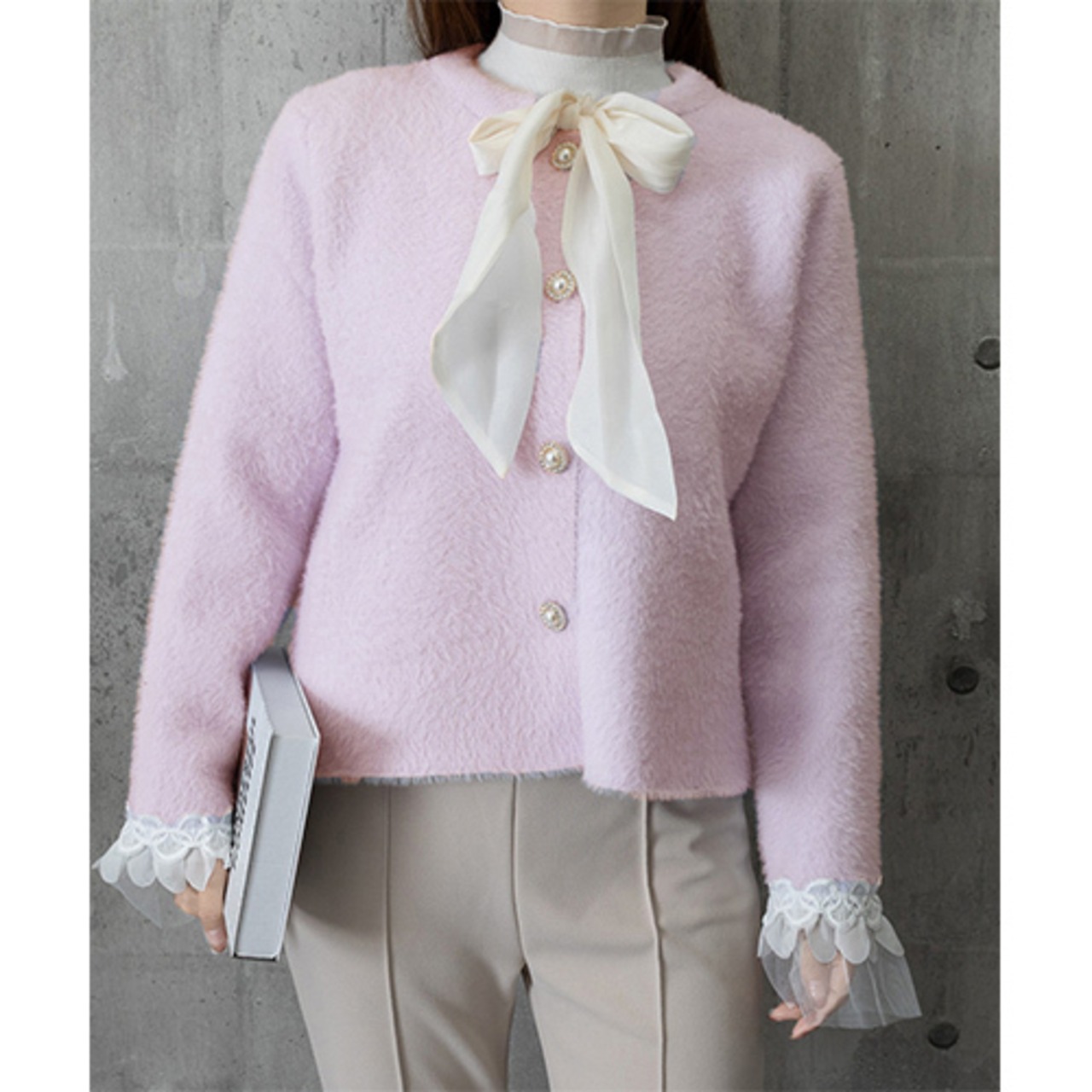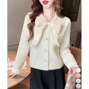 大きめのリボンタイが印象的なフェミニンニット。柔らかなシャギー調素材で優しい肌ざわりが魅力。フロントにはパール調ボタンをあしらい、上品さと華やかさをプラスしている。袖口にはさりげないレースを施し、女性らしさを引き立てるデザイン。デートや通勤はもちろん、入学式・卒業式などフォーマルな場面にも対応でき、幅広いシーンで活躍する一着。