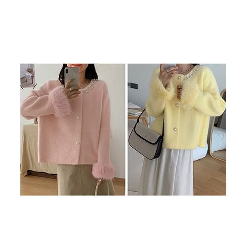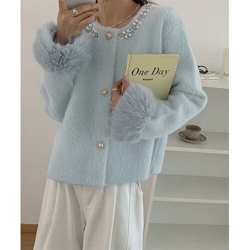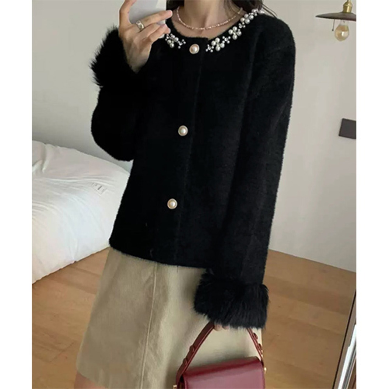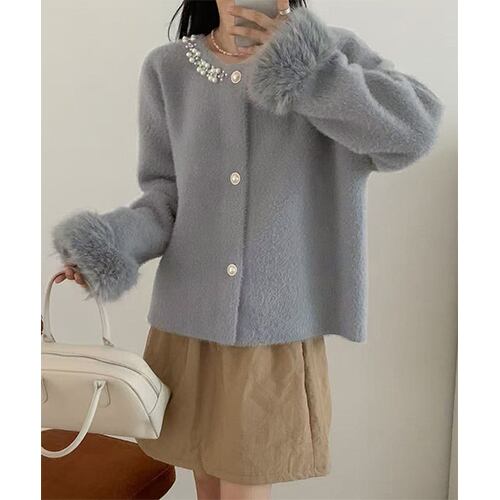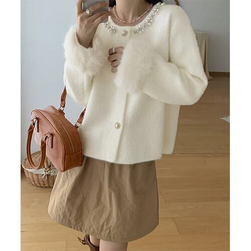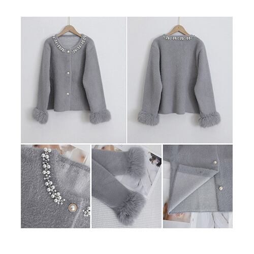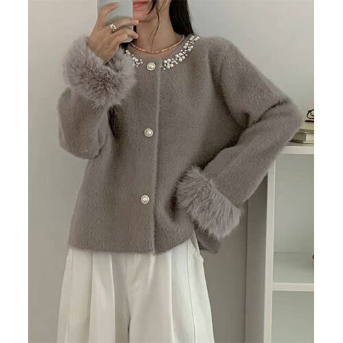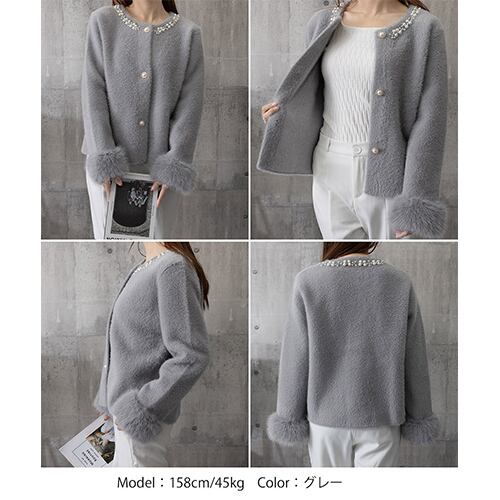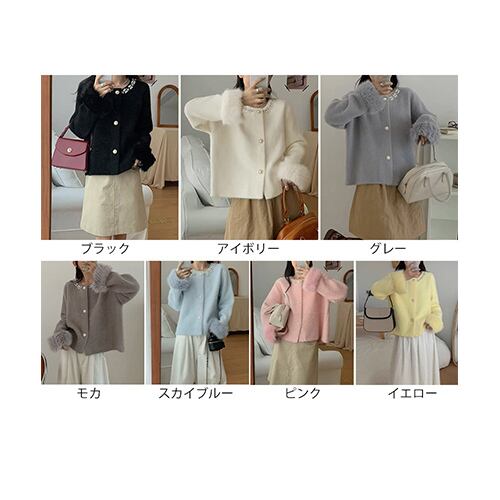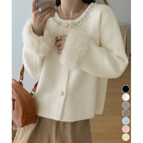 ノーカラーにパールをあしらった上品なカーディガン。柔らかな素材でちくちくしにくく、素肌にも優しい快適な着心地が魅力。ゆったりとしたシルエットで重ね着しやすく、暖かさもしっかりキープ。袖口のファーが女性らしい華やかさを添え、コーデのアクセントに。スカート×ロングブーツのフェミニンスタイルはもちろん、デニムと合わせた甘辛ミックスも楽しめる、着回し力の高い一枚。
