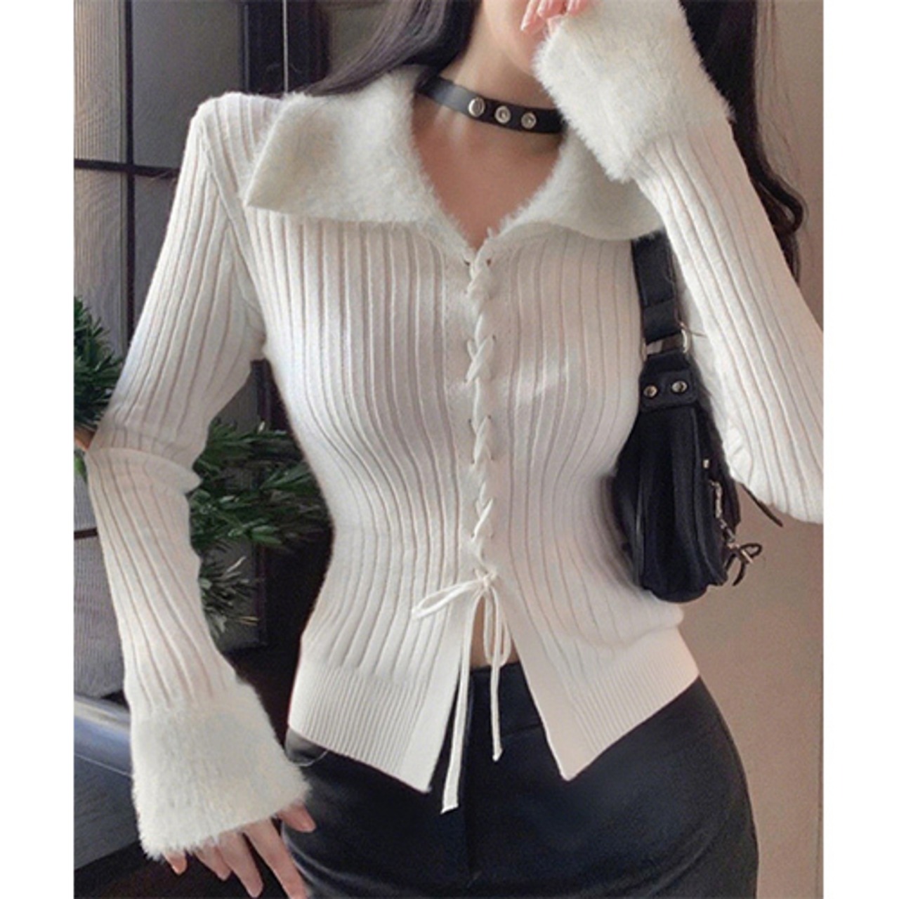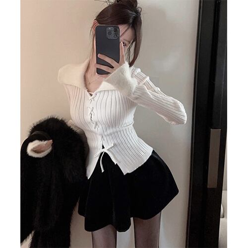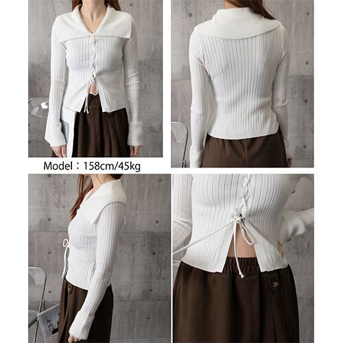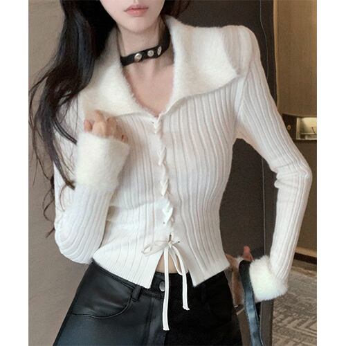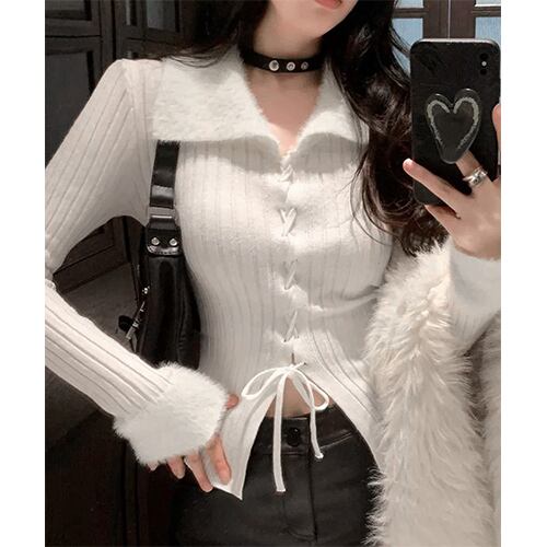 フェイクファーの襟と袖口が華やかさを添える、季節感たっぷりのレースアップリブニットトップス。ふわふわとしたフェイクファーが女性らしさを引き立て、リブ編みの伸縮性で身体に心地よくフィットしつつメリハリのあるシルエットを叶える一枚。ミニスカートやデニム、ワイドパンツなど幅広いボトムと相性が良く、大人フェミニンから韓国風まで多彩なスタイルにマッチする万能トップスに仕上がっています。